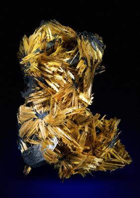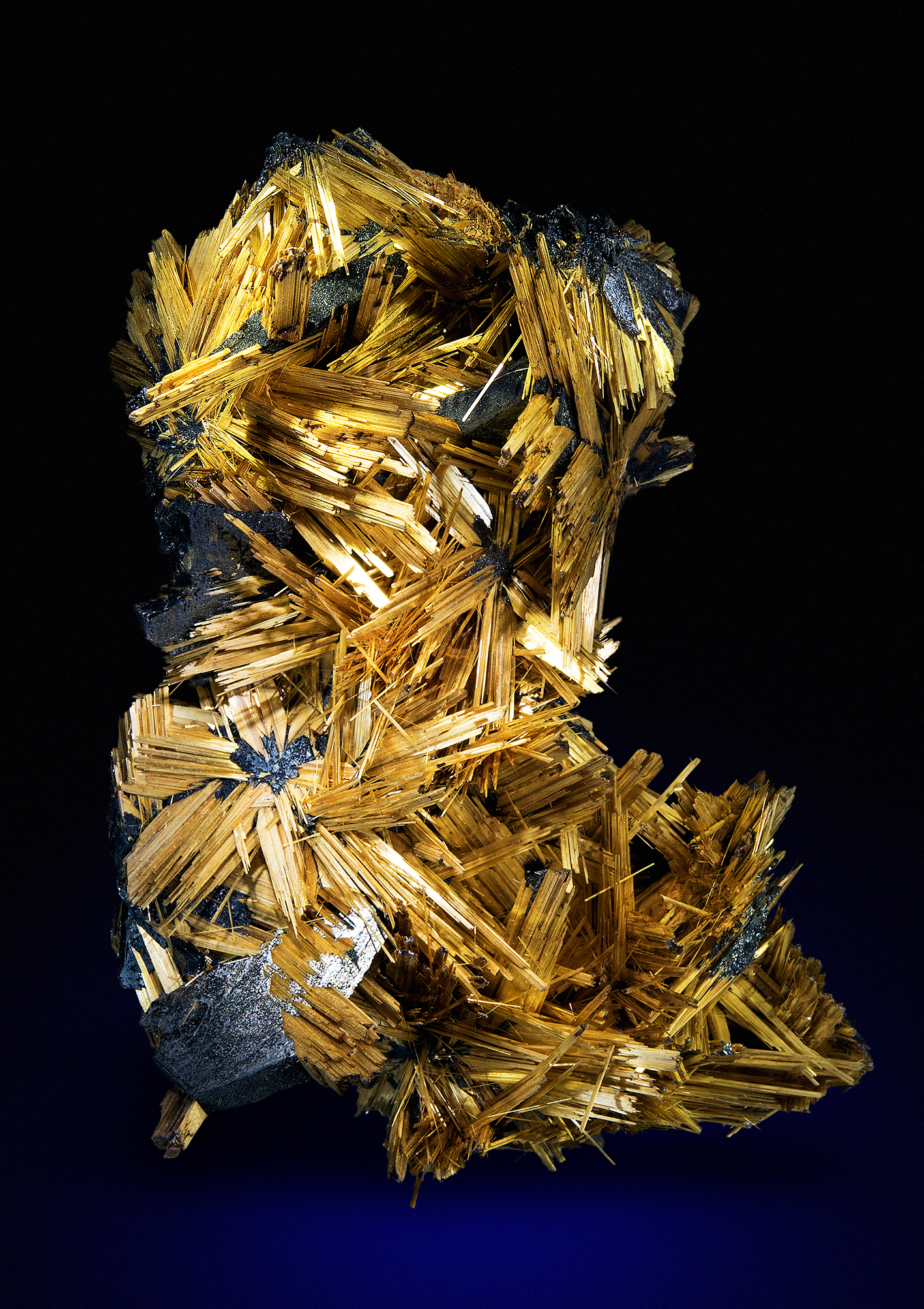 A classic mineral from Germany with elegant outline and shiny, sharp crystals. The shape of this specimen resembles the hilly landscape of St. Andreasberg where it was found. Below the shiny metallic surface of the crystals you find blood-red glowing parts that are only revealed at intense illumination. At the backside there is some smaller stilbite present. This is a fine classy specimen of high quality and grace.