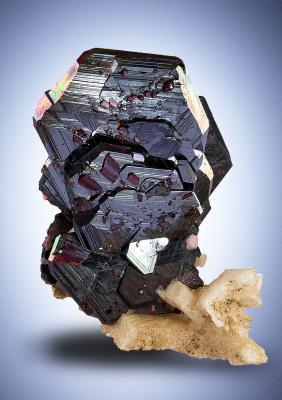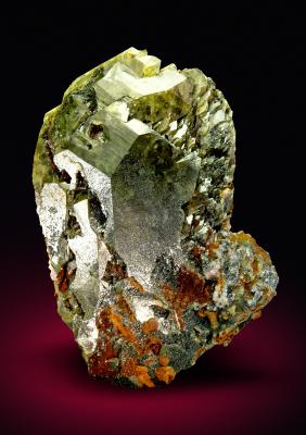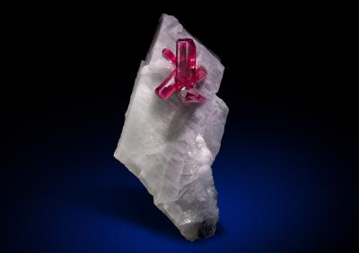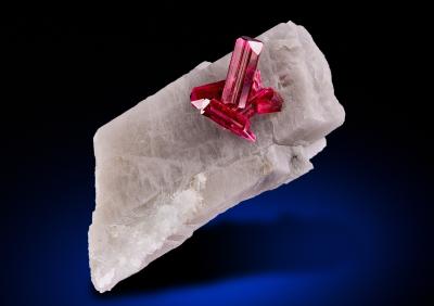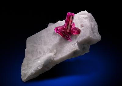 Two tourmaline crystals of amazing color-play are grown together to form this unique piece. The crystals do not need much light to reveal their intense colors that range from mossy green to a juicy raspberry red. The terminations are perfect, with only one re-healed chip. A specimen of impressive colors and nice arrangement.