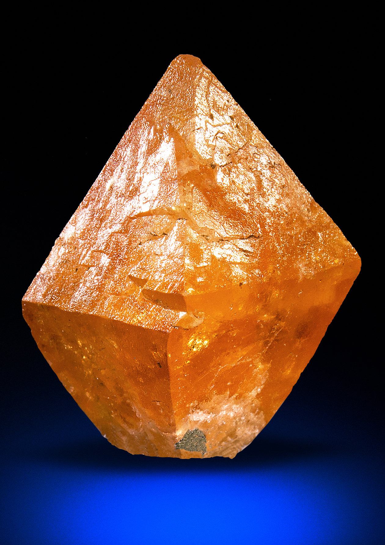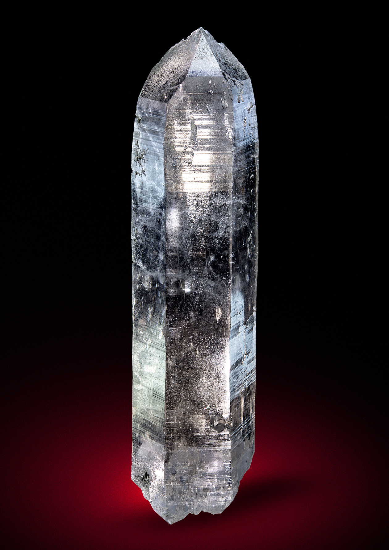 A solid, colorless single cerussite crystal of best luster and clarity. Its shape is a characteristic sixling-twin habit. The crystal is complete all around with only minor abrasions. A smaller side-crystal is damaged but which is not apparent at all. Cerussite is definitely one of the minerals Tsumeb is most renowned for. This specimen is a fantastic example for the high quality standard set at this most famous locale. Absolutely amazing!