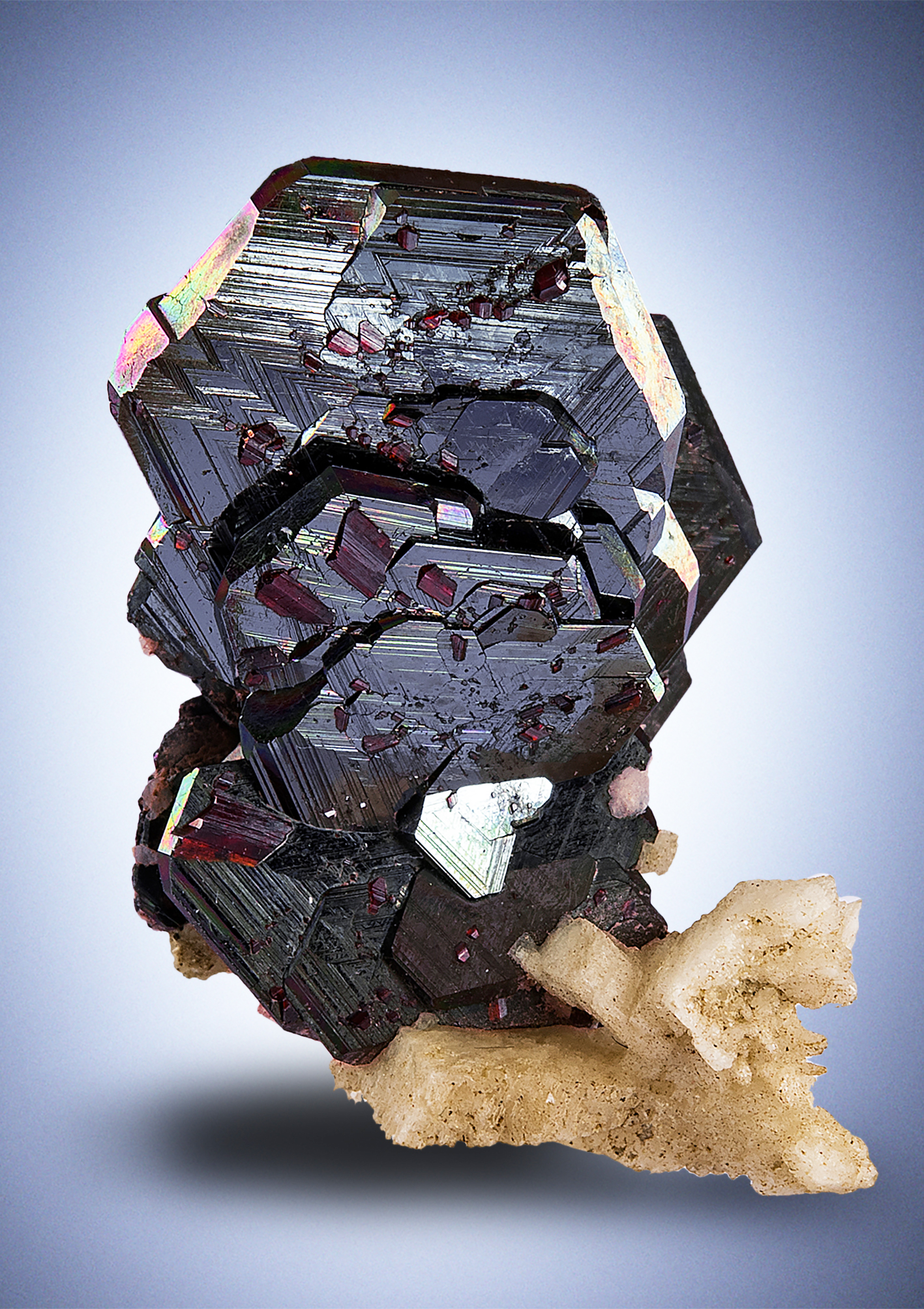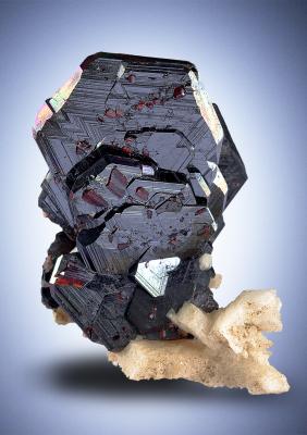 This massy calcite crystal is a shiny marvel of incredible clarity. Absolutely flawless, this crystal is a jewel of fantastic luster with fine striation that reflects the light beautifully. The crystal sits on a matrix of exactly the right proportion, accompanied by many smaller calcite crystals. Most wonderful about this piece is the perfect clarity of the calcite, which allows a view right through it and right to the bottom, where again smaller crystals are visible. A small wonder in perfect quality!