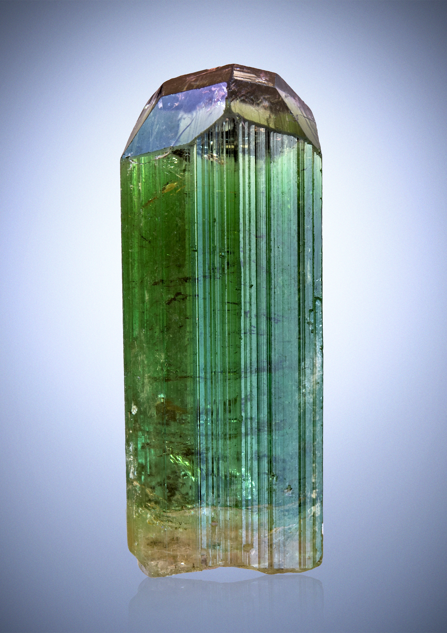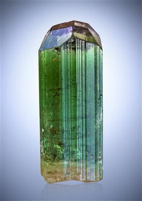 This single tourmaline crystal impresses with its top-notch quality. It's gemmy, highly lustrous, color-intensive, and displays an exceptionally complex termination. The color, as you can see in the picture and video, is mostly green with a pink zone at the tip and at the very base. However, when viewing the piece in natural light, the green appears much more nuanced. Suddenly, the color transitions from an emerald green center to a bluish turquoise, which is truly extraordinarily beautiful to behold.