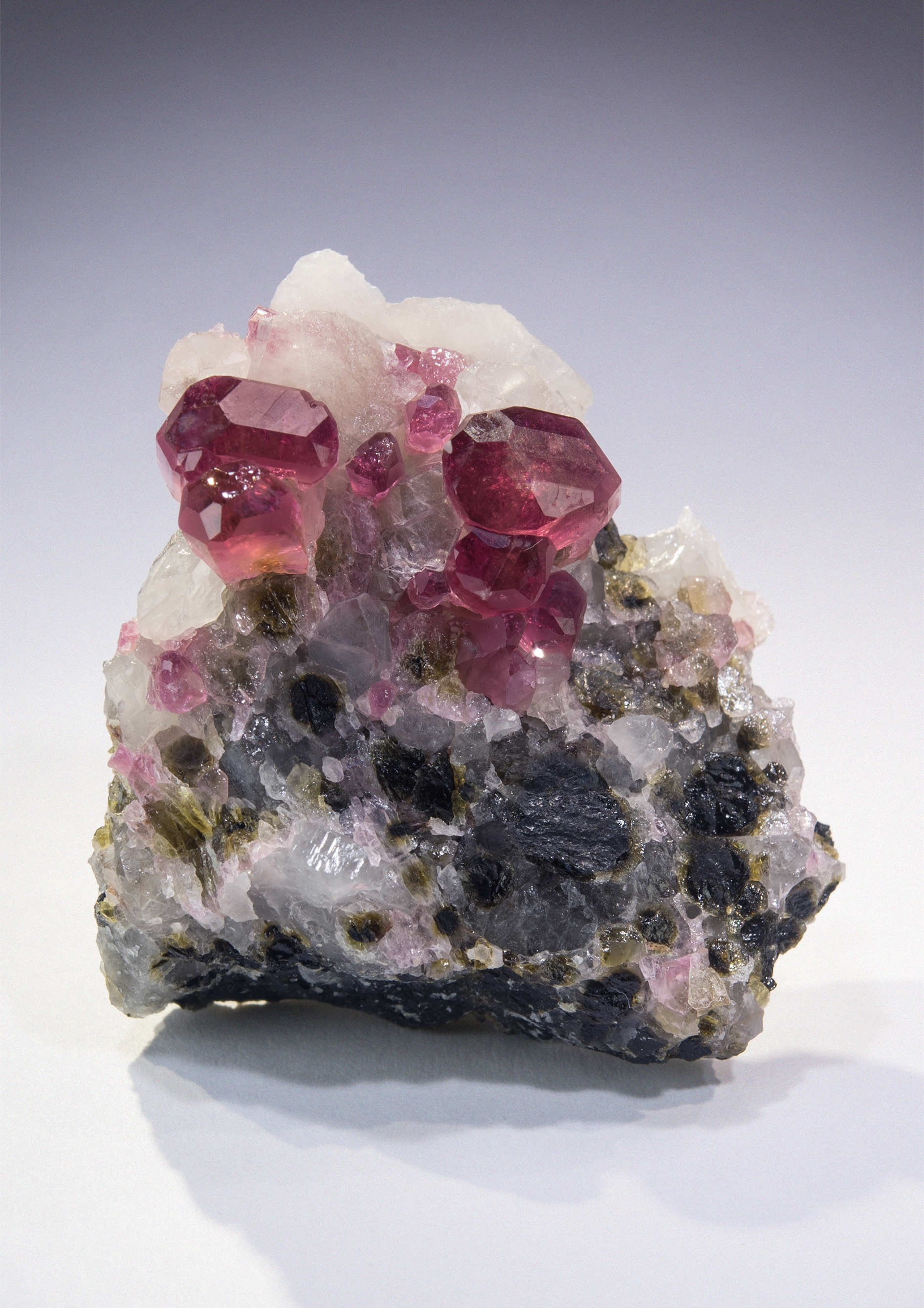 This lovely rubellite is from a recent find in Pyingyi Taung and shows brilliant crystal quality and strong color! Several sparkling rubellites are set on a contrasting dark matrix, together with white quartz crytals. The tourmalines are gemmy, intensively red and show complex terminations. Nice composition and stunning crystal quality make this piece attractive