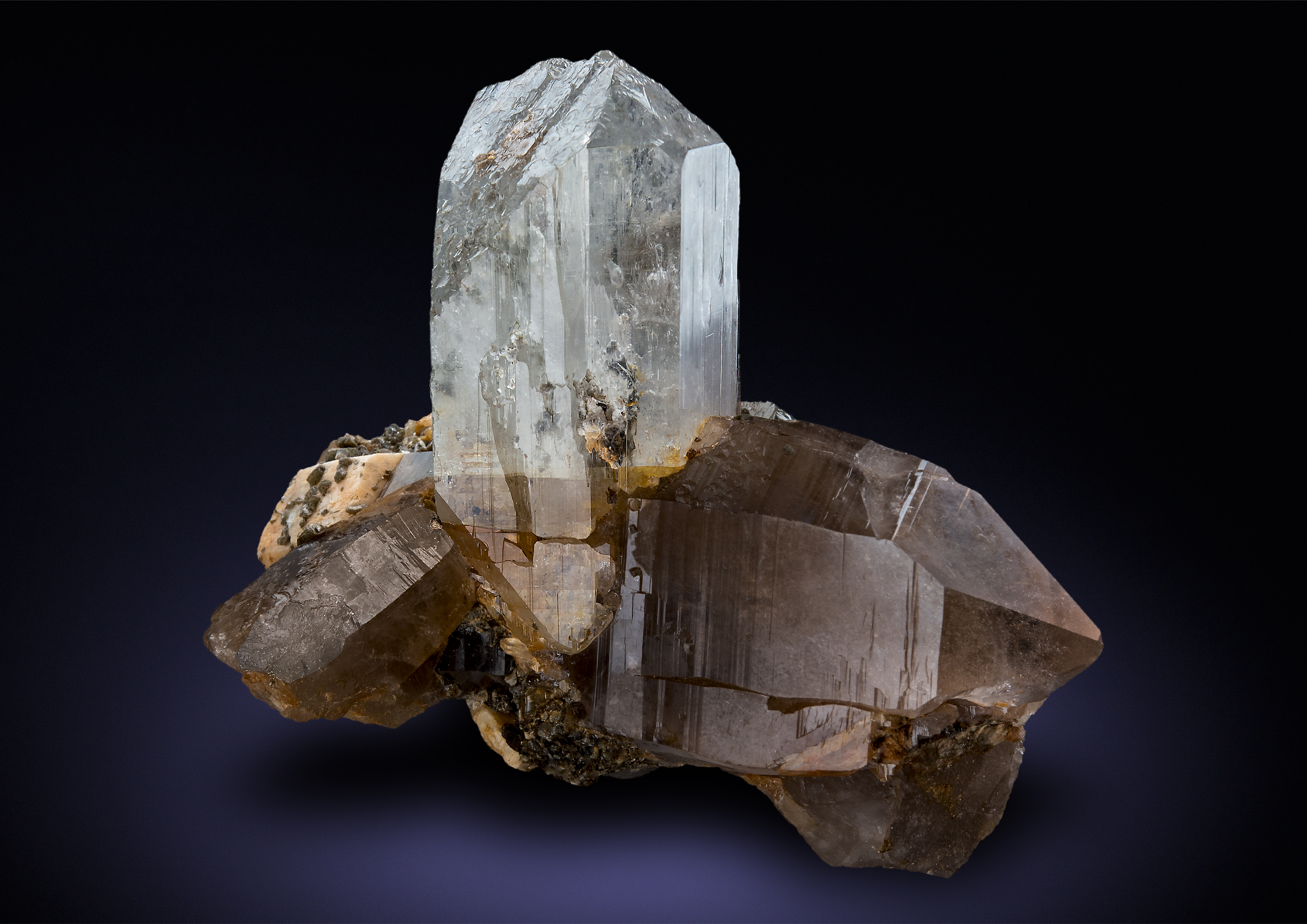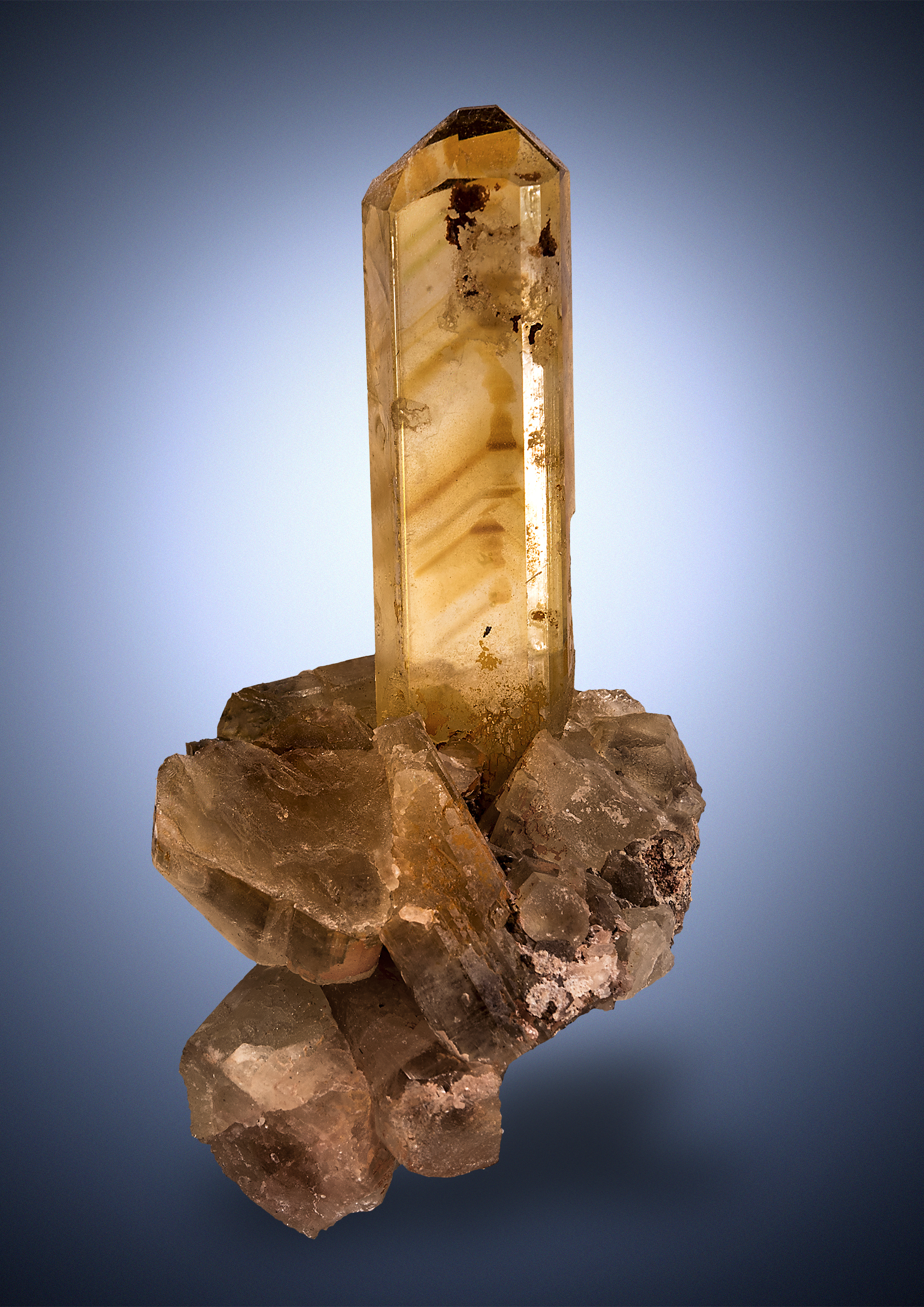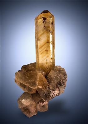 A strikingly aesthetic combination of topaz on quartz and feldspar. It has a very nice cabinet size of 9.8 cm with a brilliant 6.5 cm main topaz. The whole piece has amazing composition and fantastic crystal quality all over! We have seen others from the same locale but this one is something special indeed. The transparent, highly lustrous and completely flawless main topaz is set on a cluster of interlocked smoky quartz and orthoclase crystals with some glistening mica. Also these side crystals are well developed and in very good condition. As you can see on the picture and in the video as well it has that natural charm that is characteristic for Namibian minerals. Still, the quality and aesthetics are unquestionable and worthy of any collection of modern style mineral specimens!