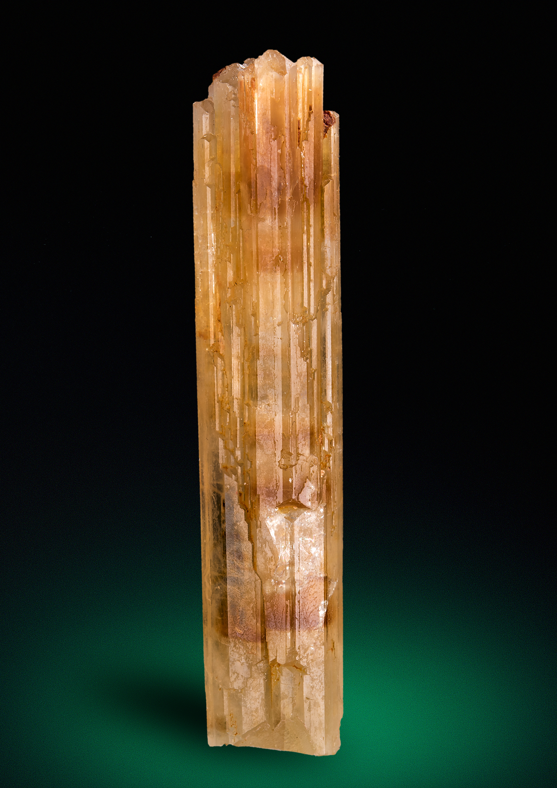 We got this unusual baryte specimen out of a collection in Namibia, which included some very beautiful barite specimens from the Tses Barite Prospect. Barite from this locality is extremely difficult to find, so we were glad to get a few beautiful specimens here! A particularly beautiful piece is this 8 cm long crystal. Typical of this locality, it shows a wonderful honey-yellow color, partially mottled with darker spots, which makes it even more lively. The crystal is of very good quality with partially transparent areas. Even in weak light, the piece glows from bottom to top with its pleasantly warm color. Upon closer inspection, I can find no damage at all. The complex termination is complex and beautifully structured down to the smallest detail.