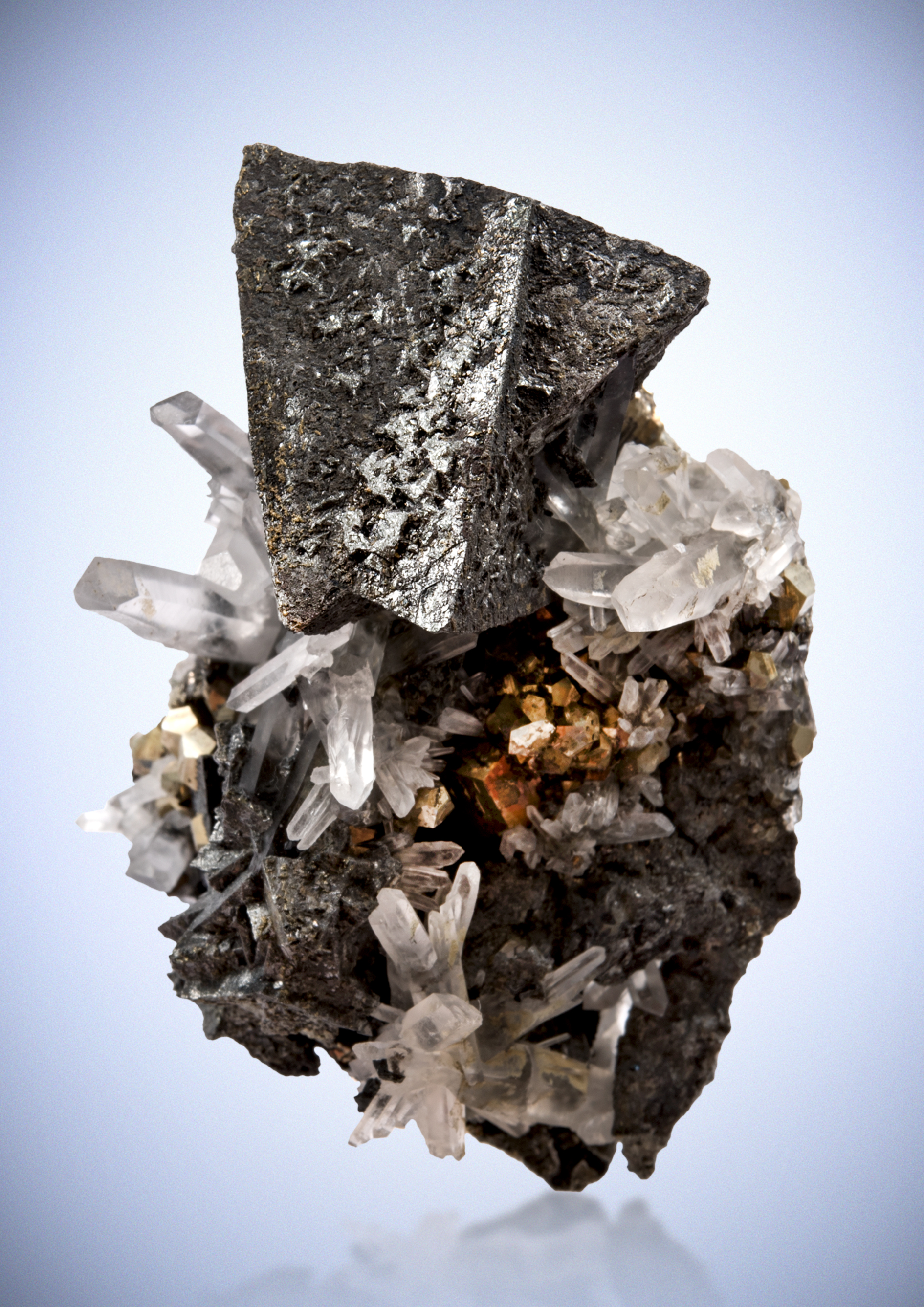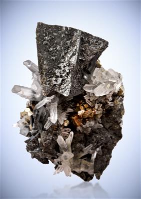 I find this tetrahedrite from the Muno Nuevo mine in Peru impressively beautiful. Most specimens of this type I've seen so far have had twisted and aesthetically unappealing crystals. Here, a single, sharp-edged, and completely undamaged crystal is prominently displayed on a beautifully crystallized matrix. Certainly one of the most striking pieces I know! The main crystal measures exactly 3 cm in its longest dimension. The matrix is a mix of white quartz, golden shiny pyrite, and smaller tetrahedrite crystals.