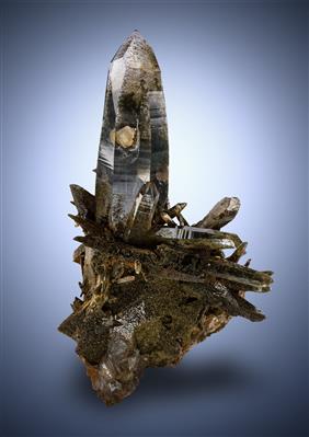 We were recently able to buy an excellent lot of quartz specimens from the Ganesh Himal range. I particularly like this specimen as it has such a vibrant aesthetic. It features a distinctive main crystal, set on a mix of smaller quartz crystals and some rock matrix, intergrown with sparkling green chlorite. Especially the main crystal impesses with its water-clear quality, the sharp and flawless shape and the top-notch luster! But also the side-crystals are in great condition with hardly any damage to find.