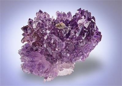 It is a vibrant spray of hundreds of crystals that display superb luster and clarity and intensive purple color.