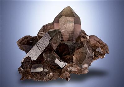 I have to say that this splendid smoky quartz gwindel is really much better in person! Fine chlorite on the surface makes it difficult to photograph even though this piece is brilliant and vibrant in person. The gwindel itself is transparent and has a wonderful smoky color without being too dark. The suface is lustrous with only little chlorite. There is no damage whatsoever, even the bottom is crystallized. On the bottom there is some white adularia and a small epidote which makes this more than just a single crystal specimen. It is a highly natural specimen of best aesthetics, great quality and considerable size!