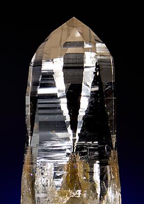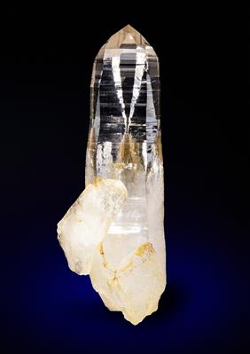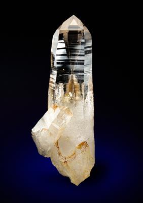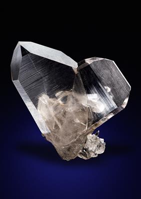 This is an elongated prismatic quartz of great transparency and luster all around. The bottom of this fine specimen is fully crystallized with terminated quartz and white accessory pericline. Also at the side face some smaller pericline crystals are perched. A side-crystal at the back is broken but which is not visible from the front. Some edges are a bit rough but most of which is contact induced with only one visible chip at the termination. All in all this is a remarkably fine quartz specimen for Rauris, with typical character and a dominant, attractive appearance!