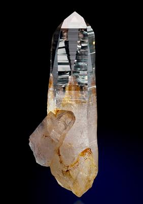 Straight, sharp and water-clear. A small but brilliant single quartz that shows some inner life through decent green chloritization. It is right handed, prismatic and virtually flawless with a contacted bottom. The termination's edges are a bit rough which seems to bee contact induced and not damaged. An excellent miniature specimen from Felbertal!