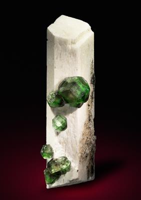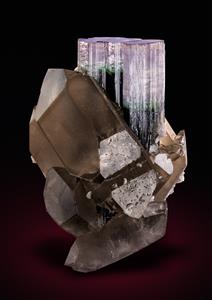 This specimen is an exceptional matrix piece showing one single topaz crystal accompanied by a colorless quartz of similar size. The topaz is 3.5 x 2 cm, highly lustrous and sharp. The color is rather intensive raspberry red, contrasting against the quartz and the calcite/rock matrix. A rare and striking specimen of Katlang-topaz on matrix!
